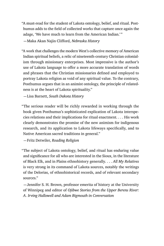 All My Relatives demonstrates the significance of a new animist framework for understanding North American indigenous culture and history and how an expanded notion of personhood serves to connect otherwise disparate and inaccessible elements of Lakota ethnography.