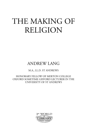 The modern Science of the History of Religion has attained conclusions which already possess an air of being firmly established. These conclusions may be briefly stated thus: Man derived the conception of 'spirit' or 'soul' from his reflections on the phenomena of sleep, dreams, death, shadow, and from the experiences of trance and hallucination. Worshipping first the departed souls of his kindred, man later extended the doctrine of spiritual beings in many directions. Ghosts, or other spiritual existences fashioned on the same lines, prospered till they became gods. Finally, as the result of a variety of processes, one of these gods became supreme, and, at last, was regarded as the one only God. Meanwhile man retained his belief in the existence of his own soul, surviving after the death of the body, and so reached the conception of immortality. Thus the ideas of God and of the soul are the result of early fallacious reasonings about misunderstood experiences. It may seem almost wanton to suggest the desirableness of revising a system at once so simple, so logical, and apparently so well bottomed on facts. But there can never be any real harm in studying masses of evidence from fresh points of view.