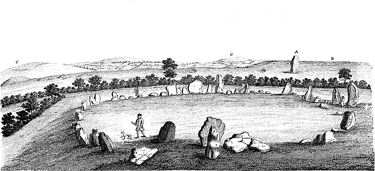 7. Mr. Camden writes further concerning our antiquity, that “the country people have a fond tradition, that they were once men, turn’d into stones. The highest of all, which lies out of the ring, they call the king. Five larger stones, which are at some distance from the circle, set close together, they pretend were knights, the ring were common soldiers.” This story the country people, for some miles round, are very fond of, and take it very ill if any one doubts of it; nay, they are in danger of being stoned for their unbelief. They have likewise rhymes and sayings relating thereto. Suchlike reports are to be met with in other like works, our Druid temples. They savour of the most ancient and heroic times. Like Perseus, turning men into stones; like Cadmus, producing men from serpents’ teeth; like Deucalion, by throwing stones over his head, and such like, which we shall have occasion to mention again, chap. XIV.