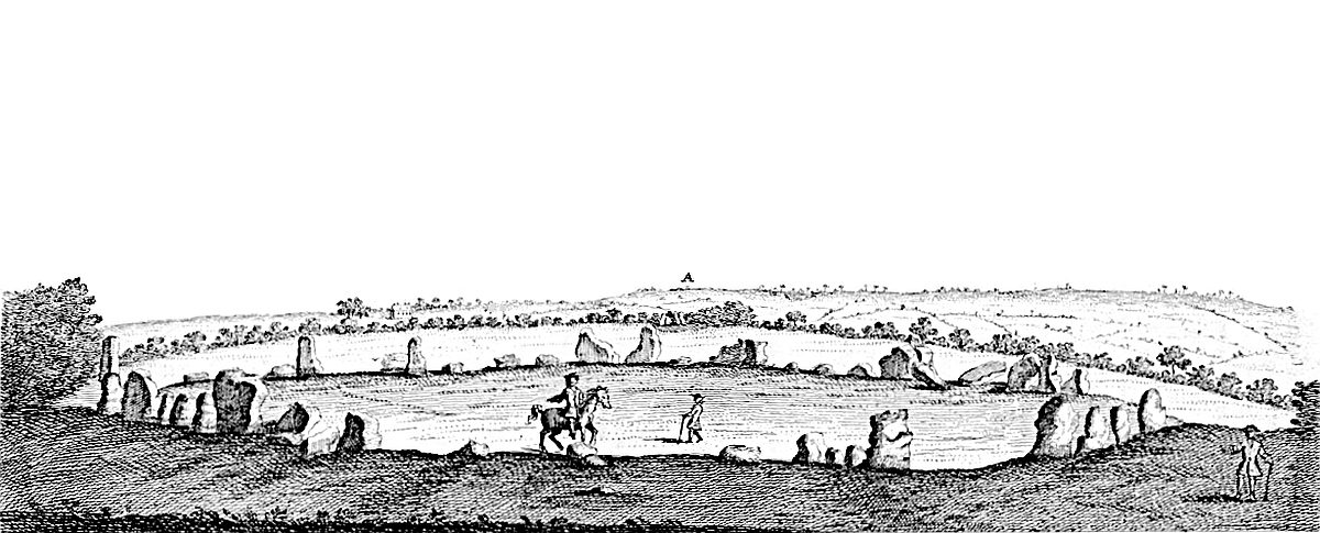 3. We observe the effect of the weather upon these works. This we are treating of, stands in a corner of the hedge of the inclosure, near the northern summit of the hill, “a great monument of antiquity,” says the excellent Mr. Camden, “a number of vastly great stones plac’d in a circular figure. They are of unequal height and shape, very much ragged, impair’d and decay’d by time.” Indeed as from hence we must form some judgment of their age, we may pronounce them not inferior to any in that respect; corroded like worm-eaten wood, by the harsh jaws of time, and that much more than Stonehenge, which is no mean argument of its being the work of the Druids.