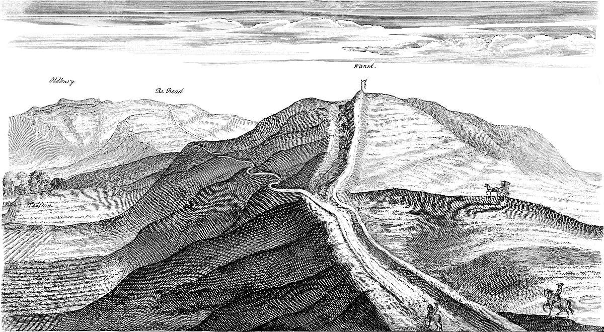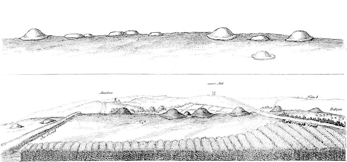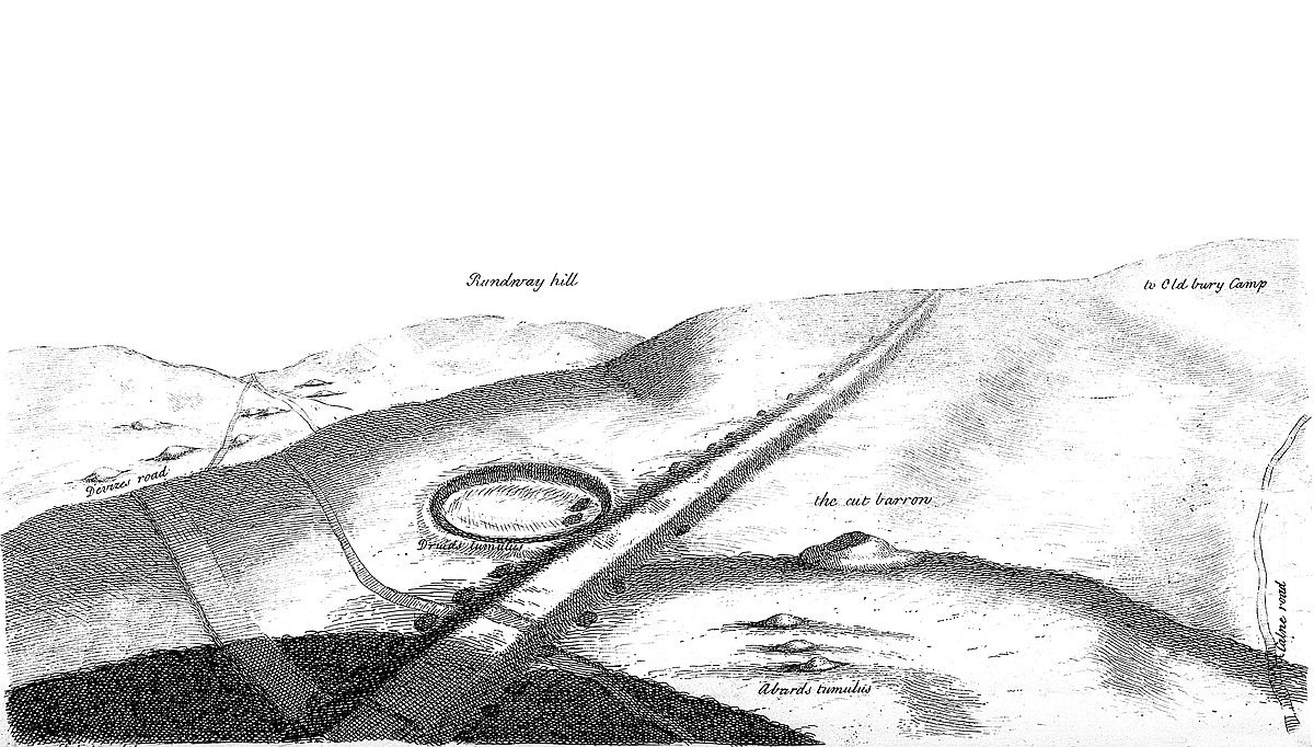 In the same plate may be seen another barrow, but circular, below the road to the left hand, on the side of the hill. Under it is a spring-head running eastward to Long Compton. This barrow has had stone-work at the east end of it. Upon this same heath eastward, in the way to Banbury, are many barrows of different shapes, within sight of Rowldrich; particularly, near a place call’d Chapel on the heath, is a large, flat, and circular tumulus, ditch’d about, with a small tump in the center: this is what I call a Druid’s barrow; many such near Stonehenge, some whereof I opened; a small circular barrow a little way off it. There are on this heath too, many circular dish-like cavities, as near Stonehenge, we may call them barrows inverted.