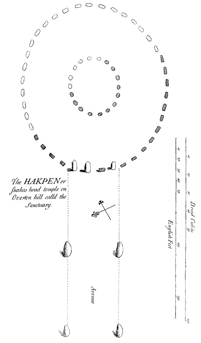 Names or words are necessary for the understanding of things; therefore 1. The round temples simply, I call temples; 2. Those with the form of a snake annext, as that of Abury, I call serpentine temples, or Dracontia, by which they were denominated of old; 3. Those with the form of wings annext, I call alate or winged temples. And these are all the kinds of Druid temples that I know of. We may call these figures, the symbols of the patriarchal religion, as the cross is of the christian. Therefore they built their temples according to those figures.