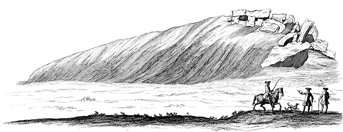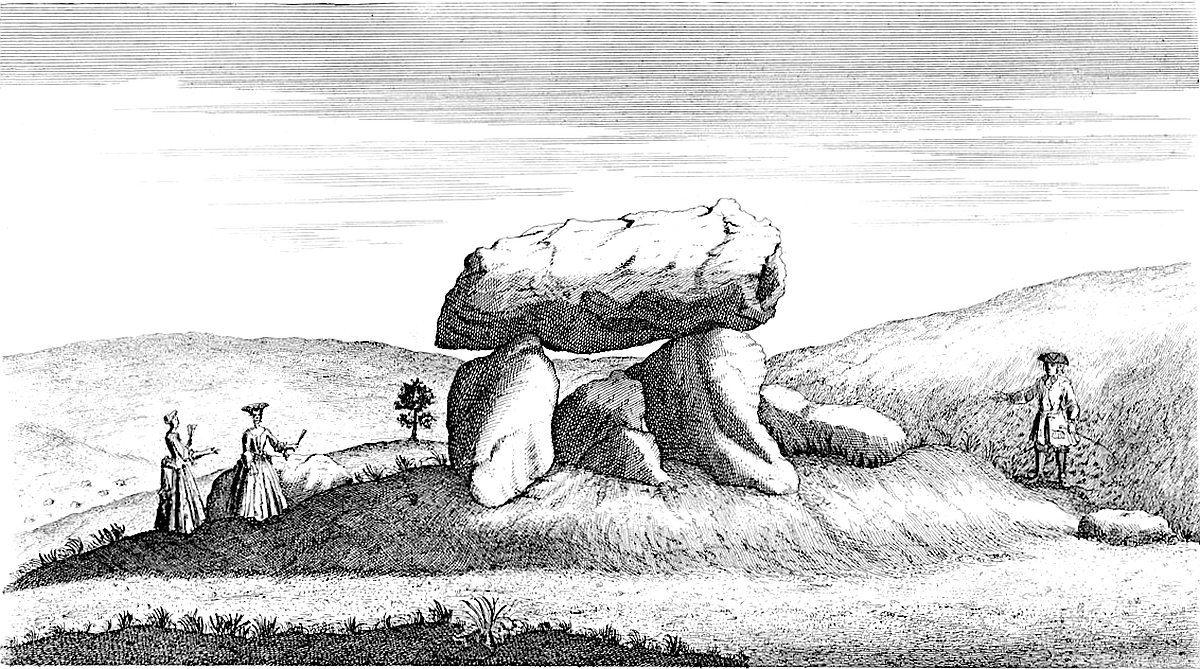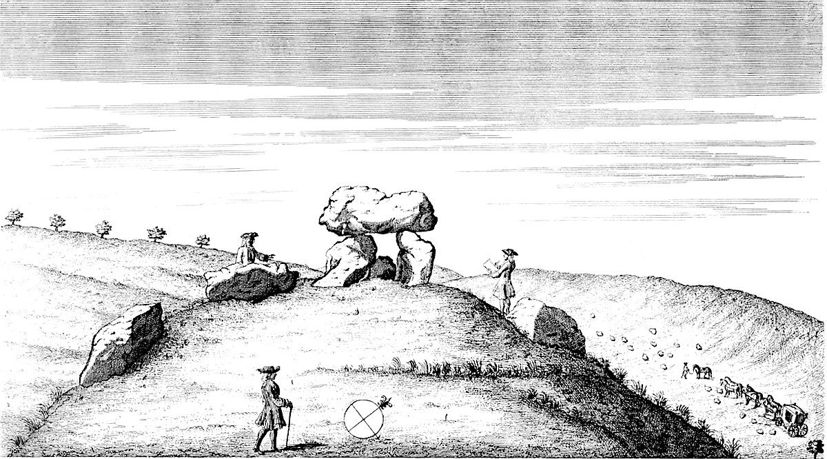 Return we nearer to the temple, and we see 300 paces directly east from it in the same field, a remarkable monument much taken notice of; ’tis what the old Britons call a Kist vaen or stone chest; I mean the Welsh, the descendants of those invaders from the continent, Belgæ, Gauls and Cimbrians, who drove away the aboriginal inhabitants, that made the works we are treating of, still northward. Hence they gave them these names from appearances; as Rowldrich, the wheel or circle of the Druids; as Stonehenge they call’d choir gaur, the giants’ dance; as our saxon ancestors call’d it Stonehenge, the hanging-stones, or stone-gallows. Every succession of inhabitants being still further remov’d from a true notion and knowledge of the things.