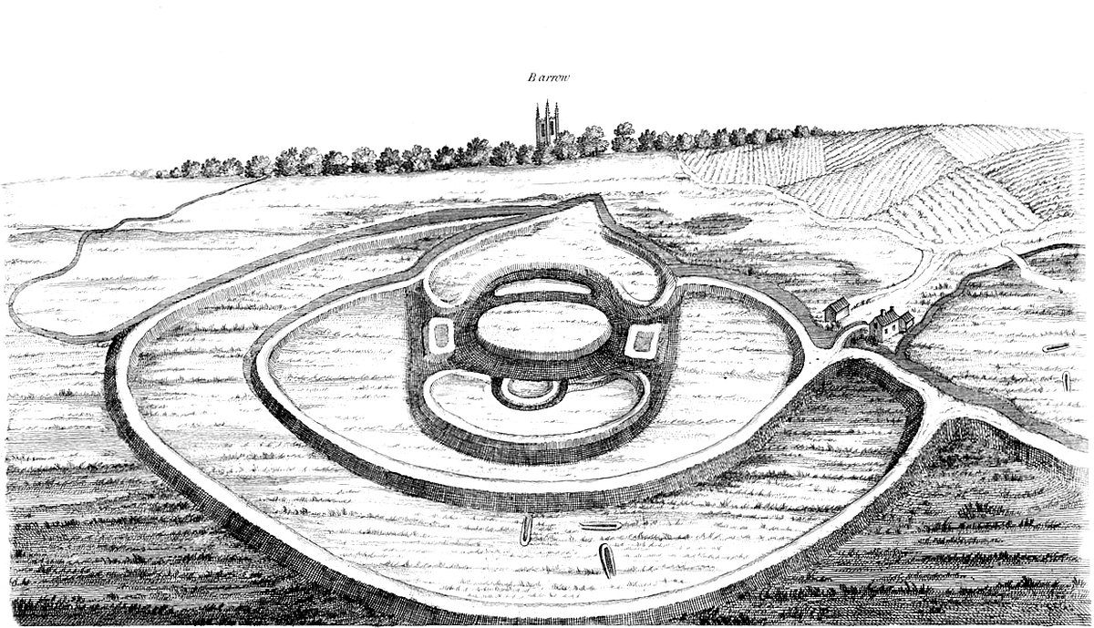 ROWLDRICH is a temple of the Druids of the first kind, a circular work which has been often taken notice of in print, lying in the north-west part of Oxfordshire: upon high ground, where the counties of Oxford, Warwick, and Glocester meet. ’Tis near the town of Chippin-Norton. Two rivers rise here, that run with quite contrary directions; the Evenlode towards the south part of the kingdom, which joining the Isis below Woodstock, visits the great luminary of Britain, Oxford, and then meets the Thames at Dorchester, the ancient Episcopal see of the Mercian kingdom. At this Dorchester are fine remains both of Saxon church antiquity, of Roman, and of British. The inquisitive that prefer our own country antiquities to the vain tour of foreign, will find much of curious amusement there. The other river Stour runs from Rowldrich directly north, to meet the Avon at Stratford, thence to the Severn sea. So that Rowldrich must needs stand on very high ground, and to those that attentively consider the place itself, it appears to be a large cop’d hill, on the summit of an open down; and the temple together with the Archdruid’s barrow hard by, stand on the very tip of it, having a descent every way thence: and an extensive prospect, especially into Glocestershire and Warwickshire. The country hereabouts was originally an open, barren heath; and underneath, a quarry of a kind of rag stone. At present near here are some inclosures, which have been plough’d up. The major part of our antiquity remains: tho’ many of the stones have been carried away within memory, to make bridges, houses, &c.