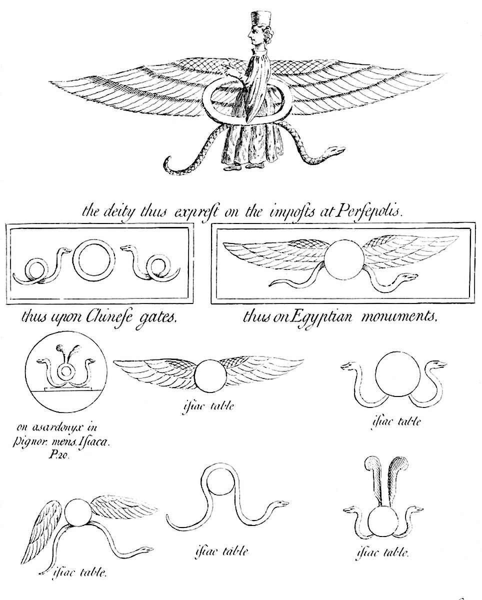 These temples of ours are always of a round form: and there are innumerable of them, all over the Britannic isles, nevertheless they are to be ranked into three kinds; for tho’ they are all circular, yet there are three manifest diversities which I have observ’d, regarding that threefold figure, by which the ancients, probably even from Adam’s time, express’d in writing, the great idea of the deity. This figure by Kircher is call’d ophio-cyclo-pterygo-morphus. ’Tis a circle with wings, and a snake proceeding from it. A figure excellently well design’d to picture out the intelligence they had, no doubt, by divine communication, of the mysterious nature of the deity. And it was the way of the ancients in their religious buildings, to copy out or analogize the form of the divine being, as they conceiv’d it, in a symbolical manner. By this means they produc’d a most effectual prophylact, as they thought, which could not fail of drawing down the blessings of divine providence upon that place and country, as it were, by sympathy and similitude.
