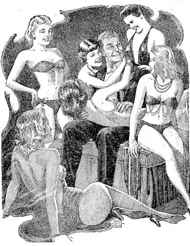 I get worried, put on some clothes and go careful over to where the closed-up house is. It is only one story high, but it sprawls all over and it cost plenty. But it isn't closed up any longer. The windows are open and Mr. Vachti is sitting in a deck-chair on a terrace, smoking a long black cigar. Then I blink; there is Jode, sporty clothes and all, waddling out to speak to him. I see a coupla men working around what I guessed was the kitchen; then I see Prof Henry Barr in person. He has been a spry old goat, but he looks all drooped and unhappy now.