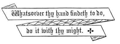 In conclusion, I would suggest an answer to a question sometimes asked—"What is the use of these scrolls?" The first most obvious reply might be—to place on our walls. The questioner persists—"But why?" Let your answer be in the sense of these words: I hope thus to impress more strongly on my mind a particular promise or commandment contained in the Holy Scriptures. I also hope that the same effect may sometimes be produced on the hearts of others, who may often, certainly, have read those words before, yet possibly without much thought; having them thus brought suddenly and in a marked manner before their eyes, deeper reflection may be the profitable result. A commandment, an injunction from God's Word, thus placed before me, may often, I trust, serve as a check in moments of temptation. A promise I know to be of inestimable comfort, as the sick and the dying have testified. No doubt the law of God must be pre-eminently written in the heart,[24] must abide there as its choicest treasure,—"a well of water springing up into eternal life," nourishing the soul at all times; and we have the precious gift of Him Who "bringeth all things to our remembrance."[25] Yet so long as I have eyes through which I may receive holy impressions, I cannot—dare not—despise the humblest means towards so good an end. To look upon a text of Scripture, engraved with fair colours and emblematic adornments, gives me the same feeling of elevating happiness, through the organ of sight, that a melodiously chaunted hymn or anthem conveys through the organ of hearing. "The hearing ear, and the seeing eye, the Lord hath made even both of them."[26]
