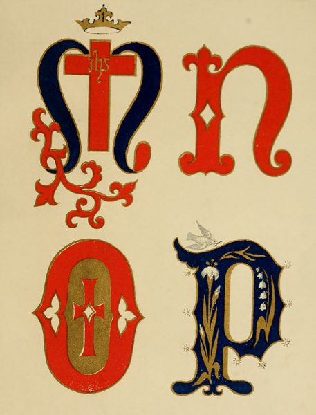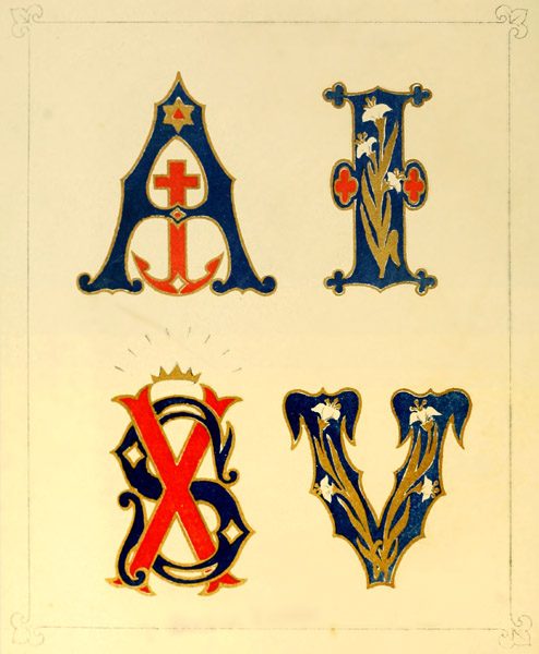 There is a small book of mediæval alphabets, published by Masters, price 2s., suited to beginners. The Book of Ornamental Alphabets, Ancient and Mediæval, collected and engraved by F. Delamotte (published by E. & F. N. Spon, 16 Bucklersbury, London), is valuable to those who can enlarge while copying; it contains upwards of forty alphabets, beginning with those of the 8th century, also several initial letters, and a page of monograms, crosses, &c.—most of the alphabets are one inch in height—price 4s. The best and most recent collection of letters that I have met with is The Handbook of Alphabets, Initials, and Monograms, engraved by William Gibbs, published by Houlston & Wright, 65 Paternoster Row, London, price 5s.