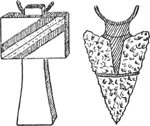 ARROWHEADS.—Those of us who have an eye for geology will have no difficulty in picking up flints, shaped like arrowheads (see p. 8), along the sides of country roads. Failing these, we can get some slips of granite, and, with hammer and chisel, shape them as shown on the page mentioned. The next thing is to obtain some gilt wire, and to make slings to support the arrowheads. These can then be hung up or worn, according to their size.