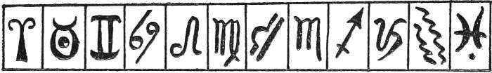 THE SCARAB.—This device is accounted very lucky or very unlucky, according to the disposition of the wearer. The symbol represents the[8] scarab beetle with its wings outspread or with them closed. Such charms are made to-day in large numbers for sale in Egypt, but those who trade in them usually claim that each particular specimen has been in the family since Biblical times. As a rule, the device is made in a rough kind of bluish porcelain and is carved, in intaglio, with divine figures. The Egyptians used to make up the scarab as a neck pendant or as a little ornament for placing in the coffins of the dead. Its mission was to scare away the evil one.