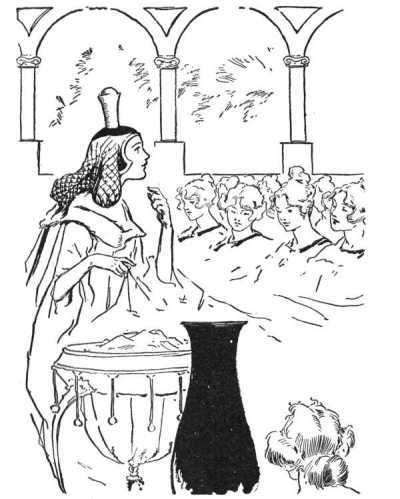 "Very well, your Majesty," said the Sorceress, "I will try to get some information to guide you. Please excuse me for a time, while I retire to my Room of Magic and Sorcery."