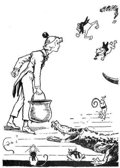When evening came Ozma ordered a great feast prepared, to which every Skeezer was invited. The village was beautifully decorated and brilliantly 275 lighted and there was music and dancing until a late hour to celebrate the liberation of the people. For the Skeezers had been freed, not only from the water of the lake but from the cruelty of their former Queen.