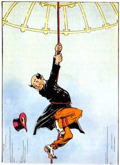 The Wizard now discovered that the rope was long enough to reach from the top of the Dome to the ground when doubled, so he tied a chair to one end of the rope and called to Glinda to sit in the chair while he and some of the Skeezers lowered her to the pavement. In this way the Sorceress reached the ground quite comfortably and the three Adepts and Ervic soon followed her.