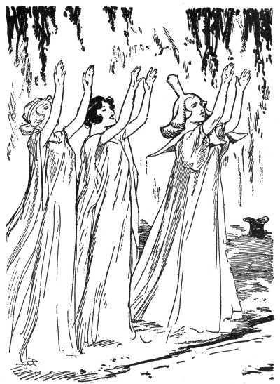 At the right of the Sorceress stood Audah and Aurah, while at the left stood the Wizard and Aujah. Together they stretched their arms over the water's edge and in unison the five chanted a rhythmic incantation.