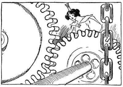 A flight of marble stairs led from one of Coo-ee-oh's private rooms down to the basement, but when the party arrived all were puzzled by what they saw. In the center of a broad, low room, stood a mass of great cog-wheels, chains and pulleys, all interlocked and 258 seeming to form a huge machine; but there was no engine or other motive power to make the wheels turn.