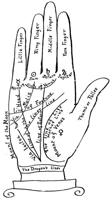 Cheiromancy, the art of foretelling the events of life by the lineaments of the hand, derived its name from the Greek word cheiros, the palm, and manteia, to foretell, whence it has been vulgarly called Palmistry—as it is named in a recent Act of Parliament to forbid its practice for gain or reward. In Coleman's Mythology of the Hindoos, p. 202, it is written: "On the Buddha's foot is the mark called the 'chakravarti,' wheel or discus, which should have been on the palm of the hand, by which the sages at his birth divined that he would rise to considerable eminence." He says (p. 19): "Various data have been assigned to the period of Buddha's existence. The most correct seems to be about 550 B.C., whence, as the sages practised cheiromancy at Buddha's birth, its existence must have been much earlier known among the Indians." "In the year 1652," writes Zadkiel, "the celebrated astrologer, Geo. Wharton, Esq., published a translation of 'a matchless piece' as vihe terms it, on the subject, written in Latin by Dr. J. Rothman." Since that period the art of cheiromancy has gradually fallen into disuse, chiefly from the extensive nonsense published by recent writers. One of the writers makes a shallow attempt to disprove the connection which exists between astrology and palmistry, while another says it is based on the principles of the Kabalah, the latter being nothing more than a mnemonical system of astrology. From the writings of Dr. J. Rothman and Geo. Wharton, Esq., I propose now to give, together with some of the choicest of those of the East, the principal matter, and to explain in the ordinary language used by palmisters such points as may require elucidation. Mr. Wharton, a careful student in these subjects, clearly proves that palmistry can only act in accordance with astrology, and that the art of cheiromancy cannot be relied upon beyond the period of from one to two years at most, for he observes in his preface, "What more convincing than if, by inspection made into the hand of any man, I truly pronounce this or that planet essentially dignified or angular in his geniture, or in such or such a position with other planets or stars, another unfortunate, afflicted or defected? Or if, on the contrary, by looking first into the geniture and considering therein the several positions of viithe planets and their configurations one to another and with other stars, I tell him, and that distinctly and truly, the lines and signatures engraven upon his head or hand—what, I say, is or can be more satisfactory than this to rational men, as touching the power and influence of the planets and stars upon these inferiors, and consequently of the lawful use and truth of the science called astrology, cheiromancy and metoposcopia, between which three sciences there appear to be such a secret coherence and harmony?"