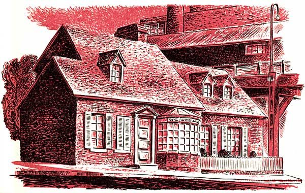 His gaze moved back to the house itself. It seemed to have been built at about the same time as the vacant storehouses opposite, for they had a similar look of design and age. The windows of Mr. Wicker's house had smaller panes of glass than were used nowadays, and like the warehouses across from it, Mr. Wicker's had many dormer windows jutting out from the slated roof. Unlike the warehouses, however, which were rickety and down-at-heel, Mr. Wicker's home was well cared for. The windows—except for the bow window of the shop to the right of the front door—had shutters painted a pleasing bluey-green, and at their sides could be seen the edges of gay curtains. The traffic freeway rose high above the roof,[15] dwarfing the old house and casting a deepening shadow over the whole length of Water Street, shading even Mr. Wicker's back door, so close did it rise beside the house. The air was filled with mechanical sounds—the roar of cars speeding up the hill, the grind of gears, the shuddering throb of wheels along the freeway, and the clanking bang of chains and weights in the factories along the shore.