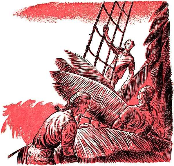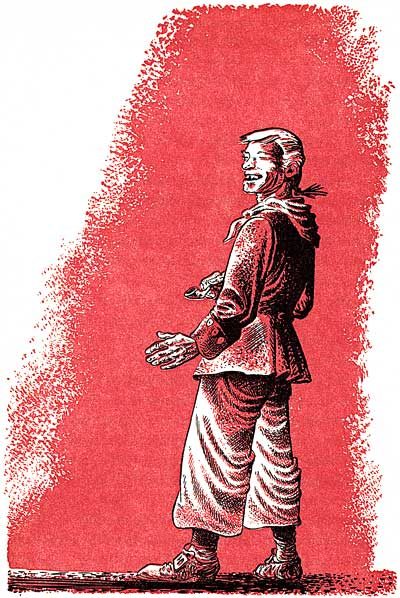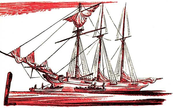 For as long as he had stopped to look into Mr. Wicker's window, which was as far back as he could remember, Chris had never known the objects to vary or be changed. There were three things that always caught his eye, amid the litter of dusty pieces. On the left, the coil of rope; in the center, the model of a sailing ship in a green glass bottle, and on the right, the wooden statue of a Negro boy in baggy trousers, Turkish jacket, and white turban. The figure was holding up a wooden bouquet, the yellow paint peeling from the carved flowers. The figure's mouth was open in an engaging toothy smile, and its right hand was on one hip, on the chipped red paint of the baggy trousers. The ship, so often contemplated by Chris that he knew every tiny thread and delicately jointed board, was a three-masted schooner, sleek of line, painted—at one time—a dazzling white. Now with dust dulling the green sides of the bottle, its sails looked loose, its sides grimed. But the name still showed at the prow, and many a time Chris, safe at home in bed, had sailed imaginary voyages in the Mirabelle. It lay there snug and captured, as if at the bottom of a tropical sea, seen through the glass sides of the bottle, and Chris never tired of looking at it.