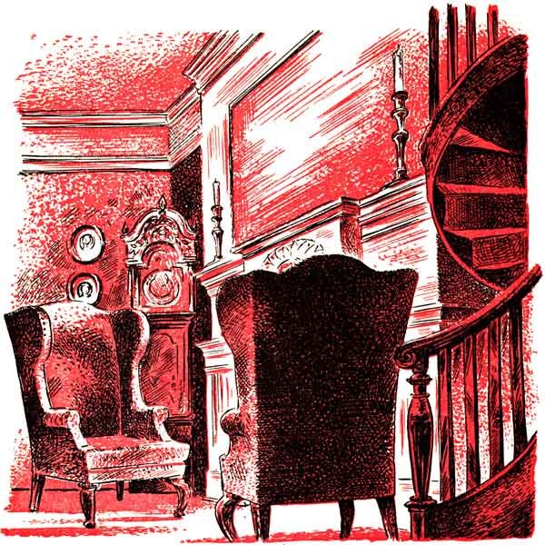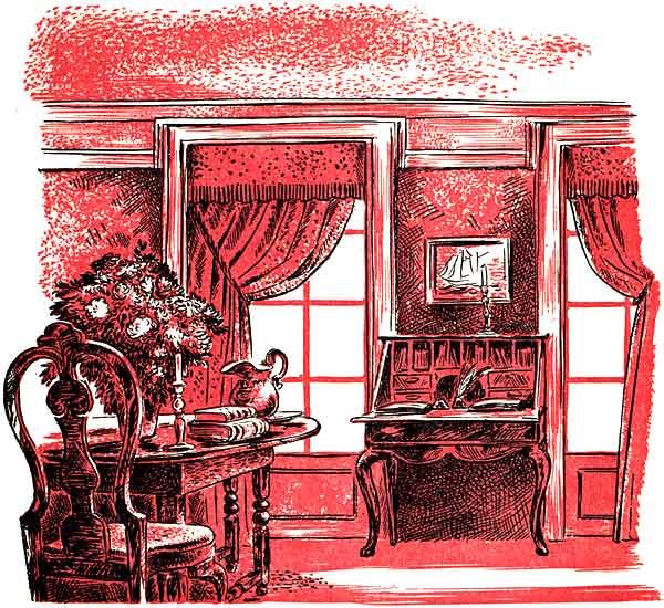 Inside, the ruby damask curtains were drawn close across the windows, for it was nearly dark, and the fire here too was as red as the rose that was the joy of a princess of China. Chris closed the door behind him, looking around with a smile at the familiar walls and objects he had missed and dreamed of, many a time, the table with its flowers in a fine China bowl, the[265] desk between the windows with the long-feathered quill pens and the papers marked by Mr. Wicker's meticulous hand, the carved cupboard at the end of the room, and the Indian rug of many colors under his feet. Last of all he brought his look back to Mr. Wicker, sitting in the winged leather chair.