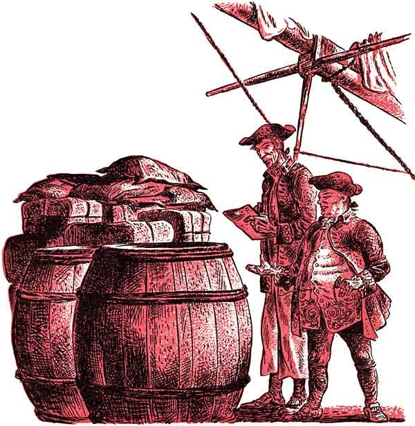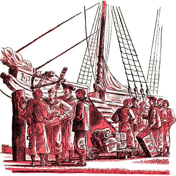 What a day that was! The greetings and handshakings; the enveloping hug for Chris and Amos from Becky Boozer, her eyes filled with happy tears and her bonnet trembling with agitation. Her roguish glances and coy giggles flew out like a flock of doves at the sight of swaggering Ned Cilley, who came down the gangplank carrying a macaw in a cage for "Mistress Boozer," and hustled her behind some bales to kiss her warmly. But most of all and best of the day, that first look from Mr. Wicker that spoke more than any gesture or carefully chosen words could have done. He had no need to speak. Chris could see the pride and pleasure shining in his face, and Mr. Wicker, so solitary all his life, could see in the boy's eyes an affection his own son might have shown him.