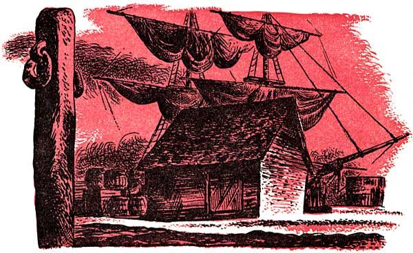 An excited happiness shook him as the Mirabelle was eased to the wharfside, and at last, after dangers and adventures beyond his imagining, Chris not only knew that he was home again, but saw a familiar black-dressed figure and a plump woman in a monstrous hat, waiting for him to disembark.