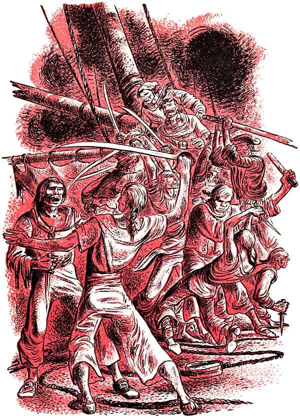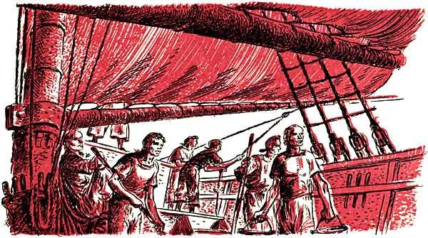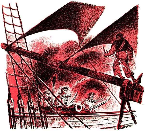 "Sir!" he cried as soon as he was within earshot, "the pirates are bested, and we can make a safe escape if you will give an order to set loose the grappling irons and lines and bid our men raise sail!" He looked eagerly at Captain Blizzard. "The pirates look pretty tired now, but the Vulture might pursue us if I didn't know a way to stop her!"