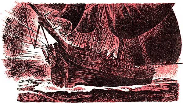 Chris returned to his own ship, and in his own shape at last, surveyed the dwindling island of mist that clung persistently[258] around the Vulture, blow though the wind might, and turn and turn again though the helmsman might try to do. How long, Chris wondered, would the mist hold? Or would the Vulture be doomed to drift at the mercy of the sea in its magic white shroud?