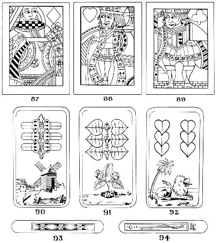 The pip cards should be studied where the future is indicated by the cards in the circle occupying places from seven to twelve, the present by those occupying positions from four to seven, the past by those occupying positions from one to four. (These numbers refer to the positions occupied, and never to the number of the pips on the cards, or to the numbers placed on the Atouts.)