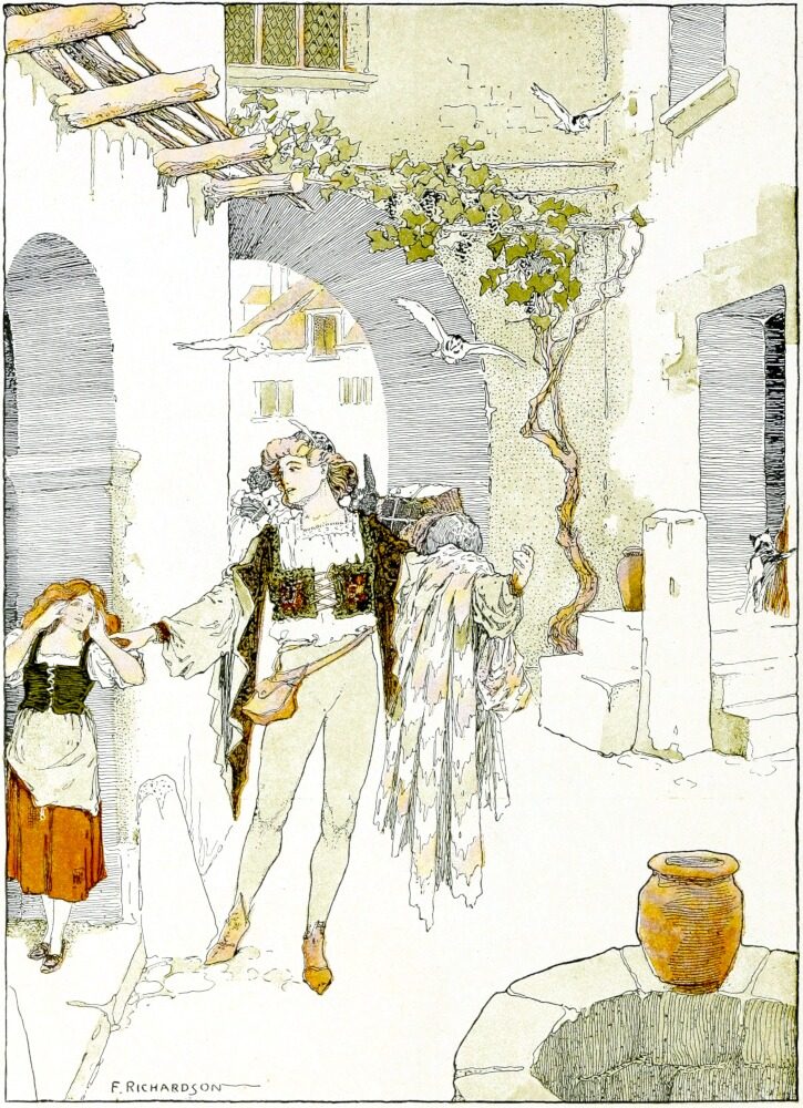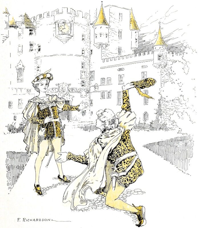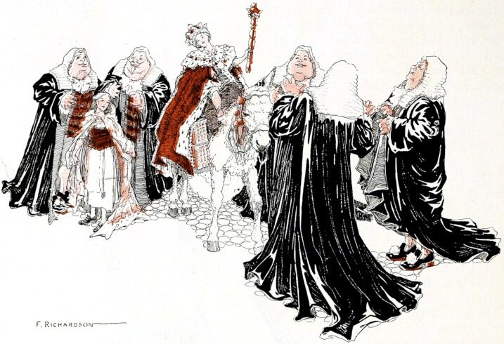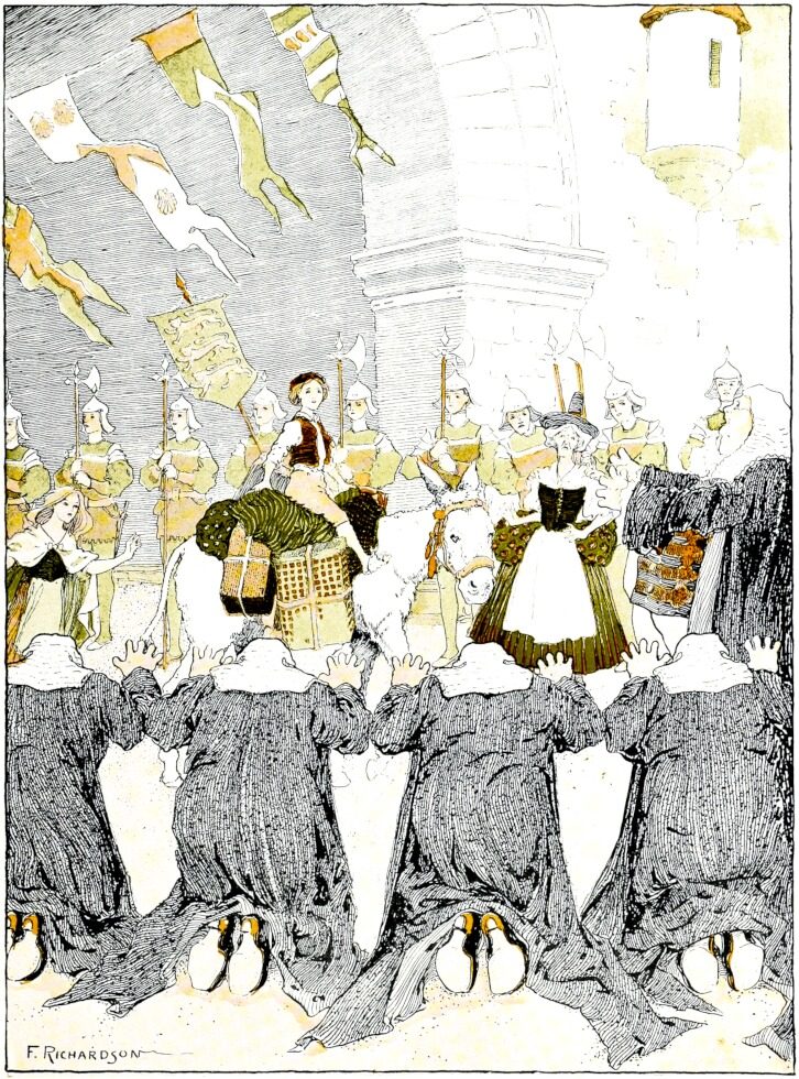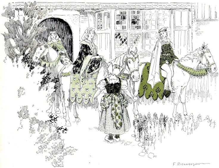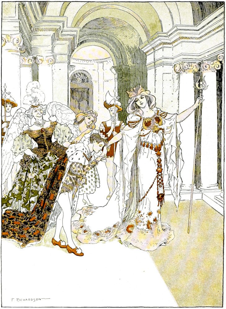 So the cavalcade came to the palace, which was thronged with courtiers and ladies in waiting.