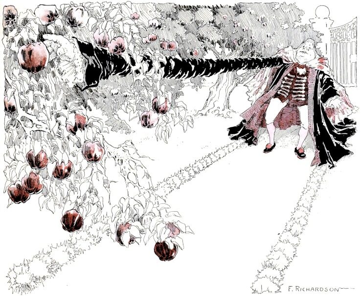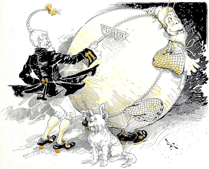 Some important changes had been wrought through the visit of the fairy. Jikki’s six servants were gone, to the old valet’s great delight. The ten-foot general had shrunken to six feet in height, Lulea having generously refrained from reducing old Tollydob to his former short stature. Ruffles, to the grief of the lord high steward, could no longer talk; but Tallydab comforted himself with the knowledge that his dog could at least understand every word addressed to him. The lord high executioner found he could no longer reach farther than other men; but the royal purse of old Tillydib remained ever filled, which assured the future prosperity of the kingdom of Noland.