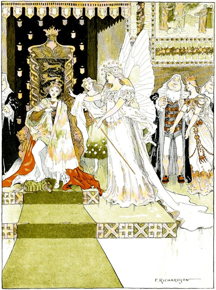 “Not so!” exclaimed a sweet voice near the king; and then all looked up to see the beautiful Lulea, queen of the fairies, standing beside the throne.