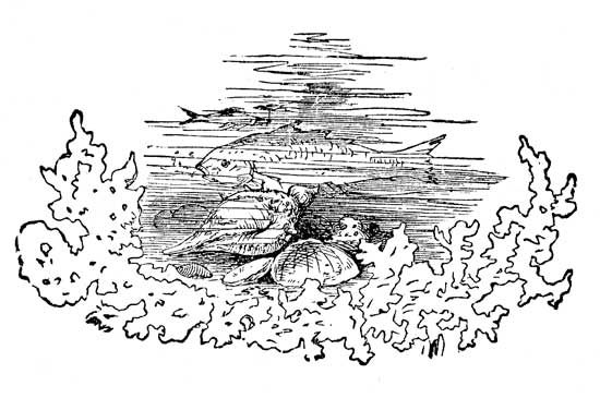 Now, after they had gone what seemed to Effie a great way, every thing became clearer, and the little man shortened his pace and began arranging his cap, which Effie had pulled out of shape, and smoothing down his sea-weed clothes; the fishes all went slowly along in their regular places, only the little fishes behind would teaze the dolphins, and the sword-fish looked as stately as the old fellow could, and gave[Pg 24] some serious digs at the dolphins whenever they showed signs of being unruly; and lastly, two or three flying-fish shot off in advance of the rest, and the procession moved slowly on.