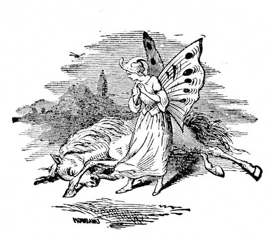 At last the procession approached, attended above and at all sides by myriads of glow-worms. Foremost came a body of Daddy-Long-Legs, who walked marvellously fast, and cleared the way for the proces[Pg 231]sion. Then a band of crickets followed all in uniform, and every one kept step to their music, though that was a difficult matter. Behind the band was the Queen Faery driving as usual her twelve Lady-Birds, which drew her acorn carriage; she was attended by a body-guard of Dor-Bugs, all in coats of mail. Then came troops of Faeries, some mounted, some on foot. They bore banners spun by the most skillful spiders and silk-worms, each company having its own device. For there were Faeries from the woods, from the streams, from the flags in the marshes, from the tops of the firs, from the sea, from the inside of caves, house-faeries, church-faeries, and gypsy faeries, that lived wherever they pleased and were always trespassing.