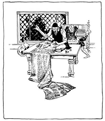 “Well, anyway,” said the One-Armed Sorcerer, “here I have ten buttons, and here I have ten threads from the genie’s head. I propose to make you a doublet, sir; a magic doublet; and for the cloth, the wasp’s nest will be the very thing. It will be a doublet worth having; and to you, sir, who have so nobly preserved us all, I will present it on—er—ahem!—on your wedding day.”
