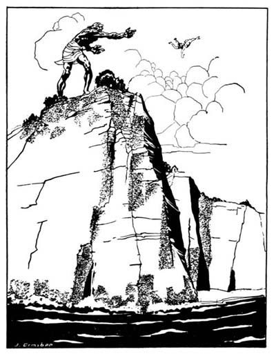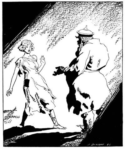 Instantly, in the flash of an eye, the dog was gone; and in his place stood, towering above me full seven yards or more, a monstrous creature in the shape of a man, chocolate[220] brown in color, baldheaded except for a fringe of long hair at the base of his skull, and bare except for a cloth twisted about his middle, in which hung a gleaming scimitar. It was a genie. He was panting with anger or some other strong emotion, and as he panted jets of fire shot forth from his nostrils. His mighty chest heaved, and I shrank back in alarm; but he spread out his hands and bowed low before me. I remembered the ring of hair on my finger, and grew bolder.
