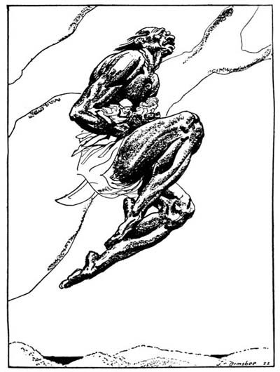 The genie stood up, and opening his great mouth in a silent laugh, stamped upon the earth so that it shook, and leaped straight up. He rose in the air in a wide curve; and before we could blink again he was gone like an arrow over the treetops, with the witch under his arm, and was no more than a speck in the evening sky.