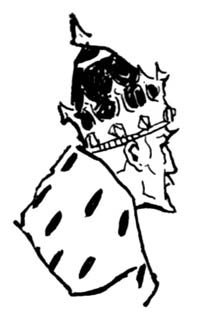 In the doorway was standing an old woman, and by her side a dog. She was a hideous old crone, wrinkled and bent, with little, beady eyes and a hooked nose and no teeth. She stood there munching her gums and blinking her eyes at me, and I noticed that she wore about her neck a string of what looked like ivory buttons, ten of them, white and flat.