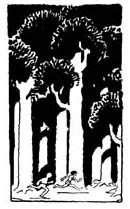 [218]The eleven wasps were flying about my head in violent agitation. The old woman said nothing, but continued to blink at me and munch her gums. Suddenly the dog barked, and without a word the old woman flung the thong from her hand. The dog gave a bound toward me and crouched for a spring, growling and bristling. In another instant I knew that I would be torn to pieces. I started back and cried out in alarm.
