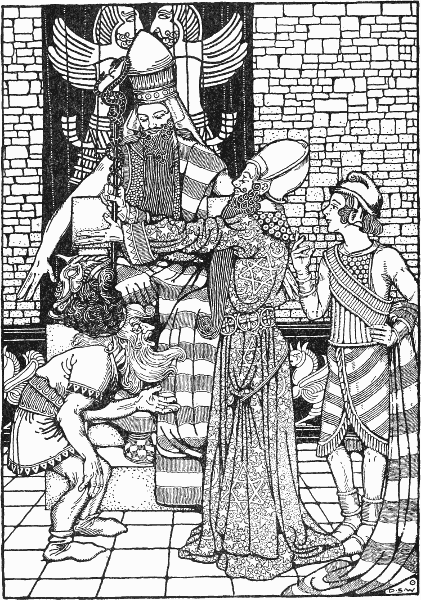 “Harut and Marut laid hands upon me. Am I to have no more mastery because of that?” said Zabulun. “For forty days I was laid in the cave that is under the sea, and do men think that all power is gone from me because of that? I thought all that time that what I worked for would come to pass, and that the Magic Mirror of Babylon would be lost in the ruin of the Tower of Babylon and that destruction would come upon[Pg 146] the Babylonians. This would have been if the boy who was my apprentice had been faithful to me. But he spoke the words that restored the mirror to the Kings of Babylon. And I, whose name, as I thought, would stand forever as one who had worked a great destruction, am as naught—my name is a name to laugh at. And shall he pass from my mastership, the boy who let this befall me? Not so; he has still to be my aid. I have paid you, his father, gold for his seven years’ service, and his service still belongs to me.”