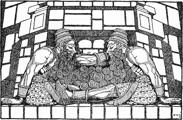 Then began the battle between Eean and Zabulun. Eean struck at Zabulun, and Zabulun struck at Eean, and each defended himself with the staff that he had. They fought their way[Pg 160] across the island, from one side to the other. They fought until their staves were broken and until they were covered with bruises. Then they threw away their staves and gripped one another. All around the island they wrestled. Strong were the hands of Zabulun upon Eean, and yet Eean was not thrown by Zabulun. Eean felt his own hands were strong upon Zabulun, and yet he could not throw him. Soon Eean lost sense of everything except two gripping and rocking figures.