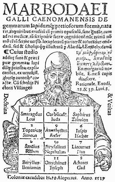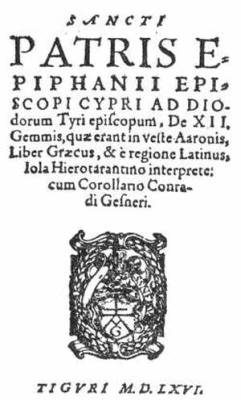 433 Sancti Patris Epiphanii episcopi Cypri ad Diodorum Tyri episcopum, “De XII. Gemmis, quæ erant in veste Aaronis,” ed. Gesner, Tiguri, 1565.