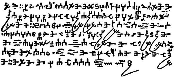 The frontispiece is supposed to be the only specimen of Satanic caligraphy in existence, and is[Pg vi] taken from the ‘Introductio in Chaldaicam Linguam,’ etc., by Albonesi (Pavia, 1532). The author says that by the conjuration of Ludovico Spoletano the Devil was called up, and adjured to write a legible and clear answer to a question asked him. Some invisible power took the pen, which seemed suspended in the air, and rapidly wrote what is facsimiled. The writing was given to Albonesi (who, however, confesses that no one can decipher it), and his chief printer reproduced it very accurately. I am told by experts that in some of the characters may be found a trace of Amharic, a language spoken in its purity in the province of Amhara (Ethiopia), and which, according to a legend, was the primeval language spoken in Eden.