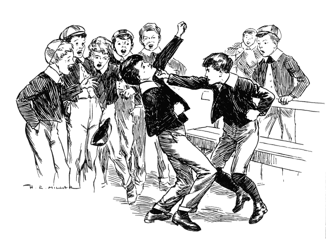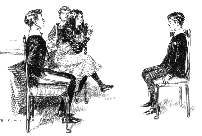 Well, there was no help for it. The box was packed, the cab was at the door. The farewells had been said. Maurice determined that he wouldn’t cry and he didn’t, which gave him the one touch of pride and joy that such a scene could yield. Then at the last moment, just as father had one leg in the cab, the Taxes called. Father went back into the house to write a cheque. Mother and Mabel had retired in tears. Maurice used the reprieve to go back after his postage-stamp album. Already he was planning how to impress the other boys at old Strong’s, and his was really a very fair collection. He ran up into the schoolroom, expecting to find it empty. But some one was there: Lord Hugh, in the very middle of the ink-stained table-cloth.