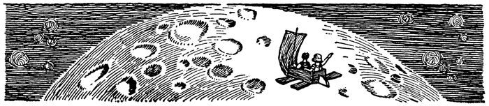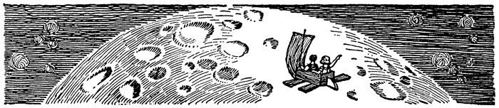 As they sped along above the Moon, they watched the wonderful changes in coloring below them. They saw many cities and villages and looked into enormous craters of extinct volcanoes.