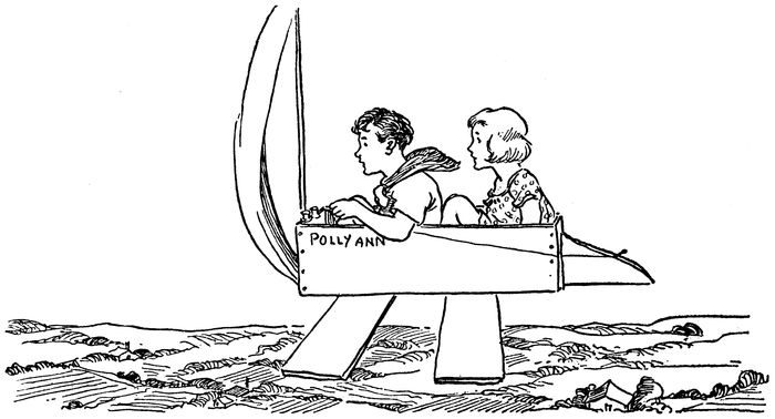 When Janey came out with a tiny basket of lunch Johnny had marked “Polly Ann” on both sides of the box. He had fastened the sail made from the old sheet to a stick and run a string through a screw-eye, so that the sail could be raised or lowered whenever they might wish.
