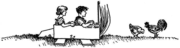 The Polly Ann shot up over the fence, suddenly, scattering the startled chickens in all directions, and as Johnny and Janey crouched low in the box the familiar objects about the farm whizzed by them like bullets.