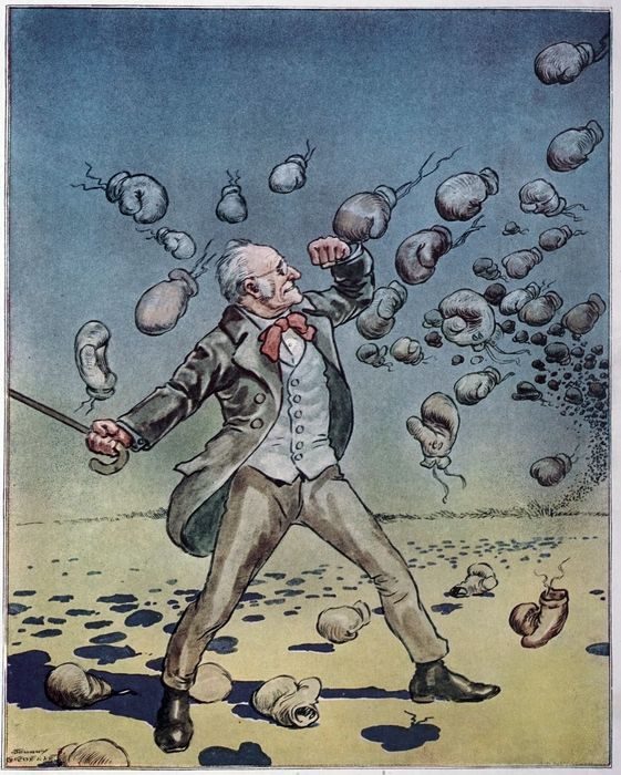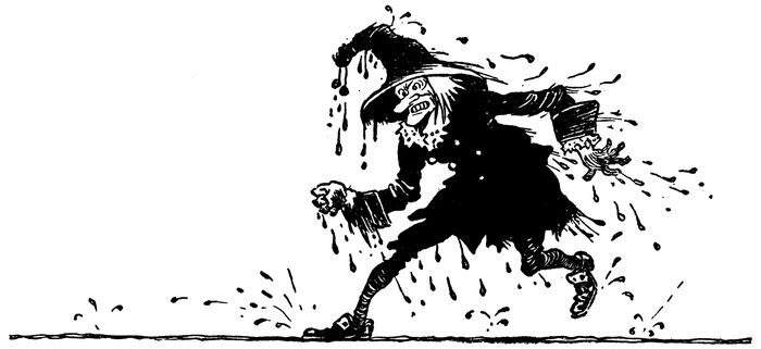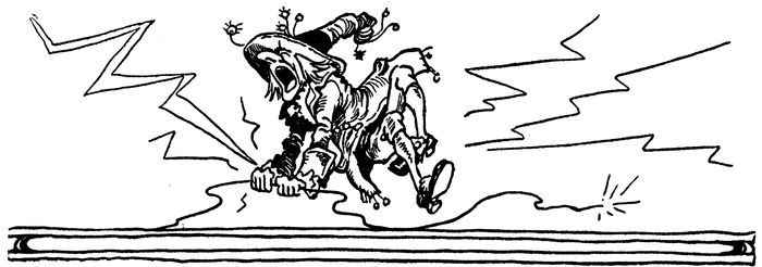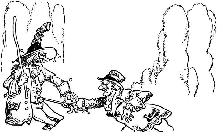 But although he dodged and gave ground Gran’pa waited for an opening and at last, as the Magician missed a swing at Gran’pa’s head, Gran’pa drew his cane back over his shoulder and brought it down with all his might upon old Jingles’ crown.