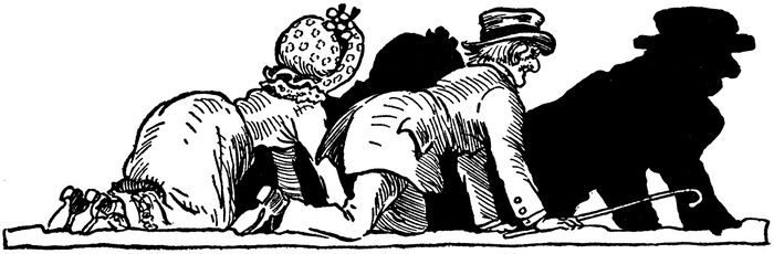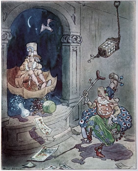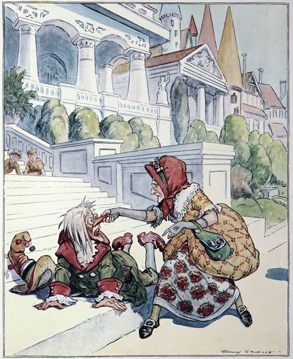 Just as this moment the Dancing Master rushed down the steps and blew a puff from the magic bellows upon the face of old Jingles. It first formed a puffy white cloud, then it settled grain by grain. There was a breathless silence.