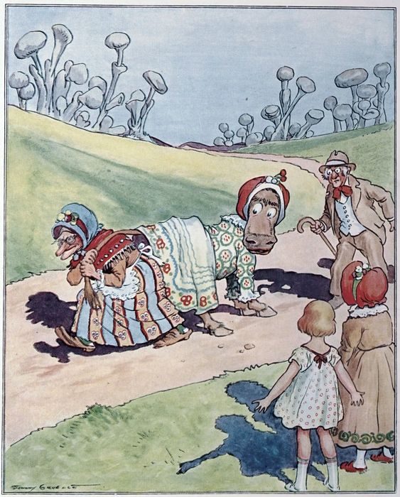 So Gran’ma waited until old Jingles had stopped rolling, then she rushed at him, and, catching his long nose in her hands, she gave it a tweak.