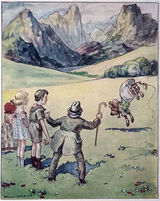 “We can’t do it!” Janey cried, the tears coming to her eyes. “We can’t make it go down as we want to! We’re only flying in a circle above Gran’ma’s farm. See! Gran’ma and Gran’pa and a lot of other people are out looking at us!”